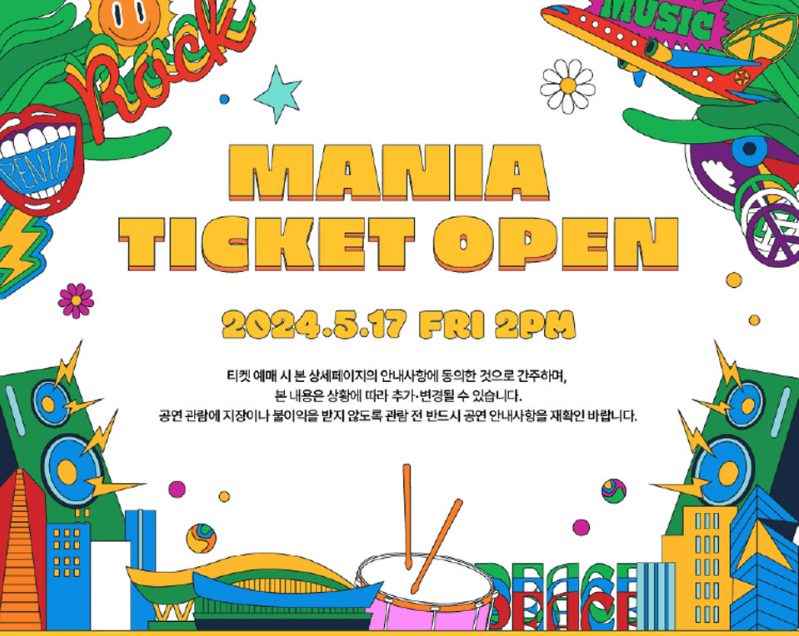 예매하러 가기 오늘 보지않기 위 사진과 같이 2024 인천펜타포트 락 페스티벌 2차 라인업 공개 직후 이뤄진 ‘마니아 티켓’이 발매 시작하자마자 매진되었는데요. 이번에는 2024 인천펜타포트